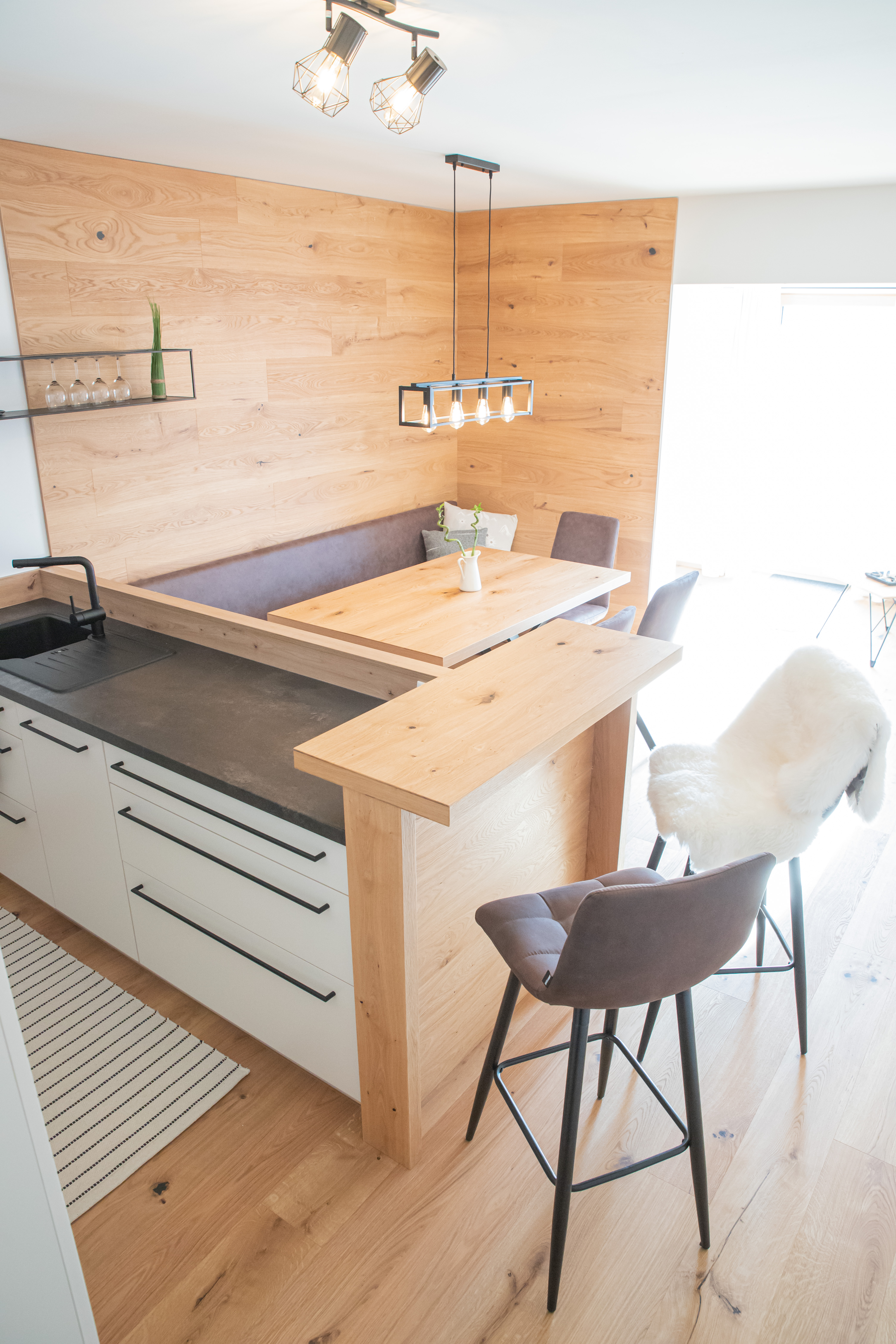 Mit Sorgfalt ausgewählte Naturmaterialien und warme Farbtöne kreieren ein besonderes Ambiente zum Wohlfühlen. Hier können Sie ganz für sich sein und den Moment genießen – ob gemütlich bei einem Buch im Wohnraum oder am Panoramabalkon beim Betrachten der tief verschneiten umliegenden Bergwelt.